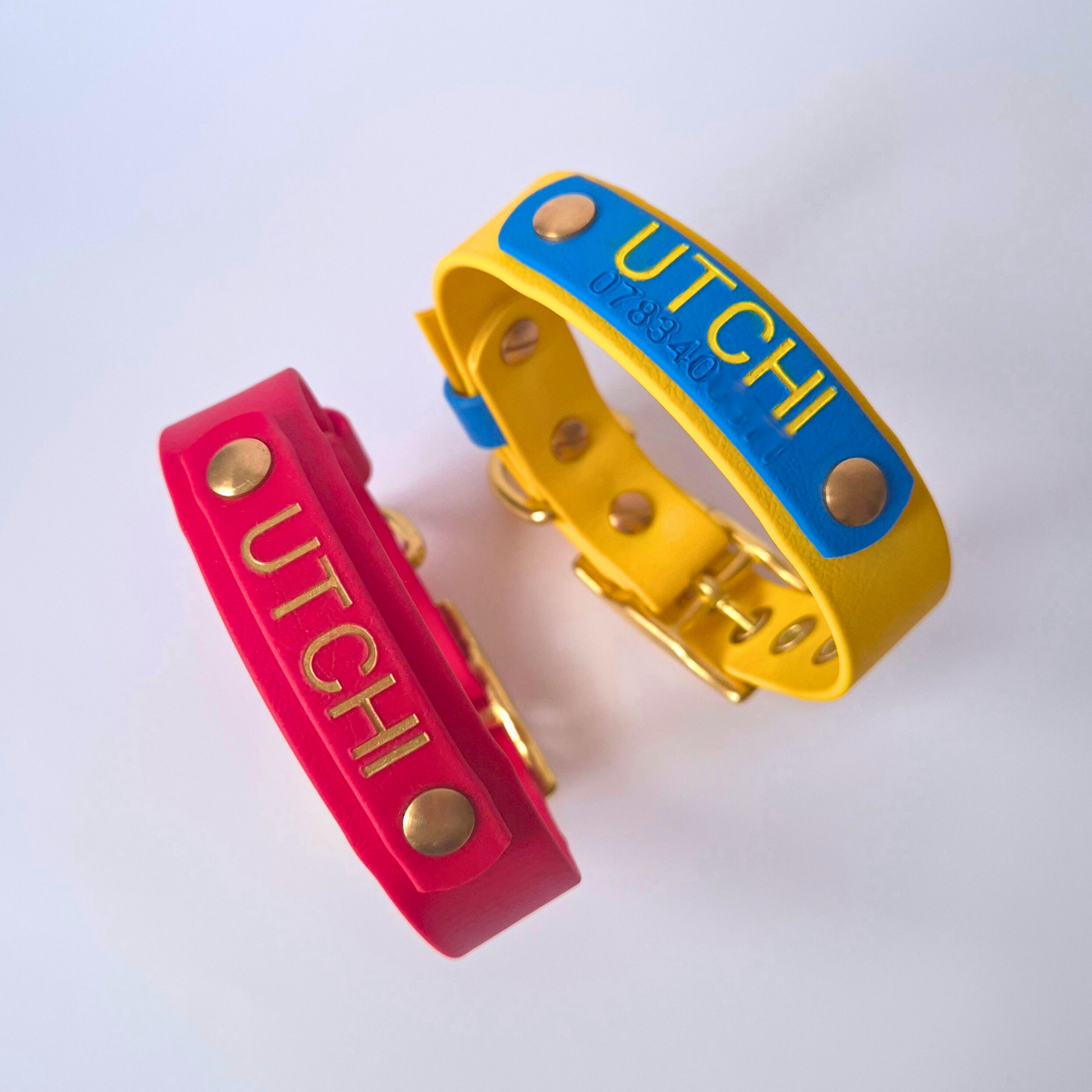 Ajouter cette option à votre accessoire choisissez une couleur de BioThane, la largeur, un prénom ou un prénom + un numéro de téléphone, vous pouvez même ajouter une couleur de peinture dans le prénom ! ✨